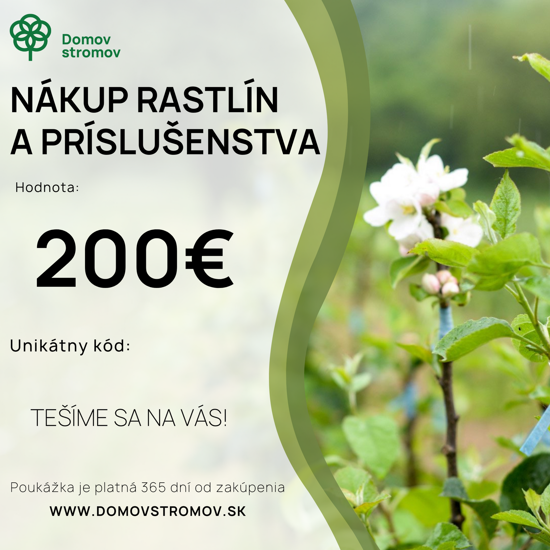 Darčekový poukaz Vám po zaplatení príde na Vašu emailovú adresu a obdarovaný/-á ho môže uplatniť na nákup stromov a príslušenstva osobne v našej predajni v Moravskom Lieskovom alebo vložením unikátneho kódu pri nákupe v našom e-shope. Platnosť poukazu 365 dní od zakúpenia.