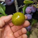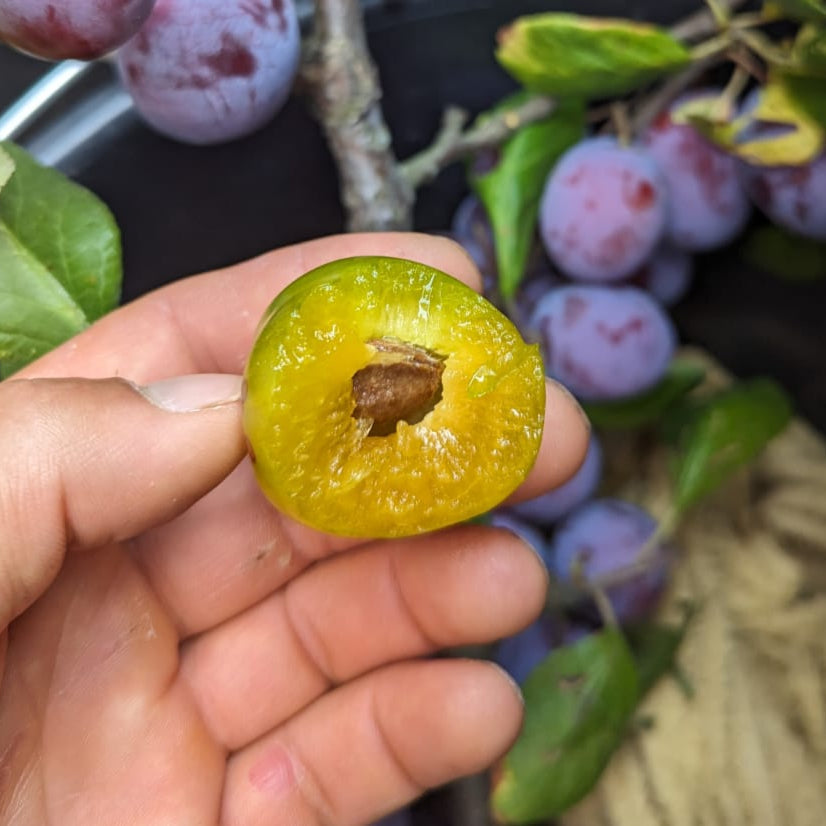 PLODY: stredne veľké až veľké (priemerne 30 g), guľaté, asymetrické. Šupka je tenká, žltozelená, na slnečnej strane červeno pruhovaná, bodkovaná či striekaná, modravo osrienená. Dužina je žltá, mäkká až stredne tuhá, stredne až veľmi šťavnatá. Chuť je sladkokyslá až veľmi sladká, aromatická, veľmi dobrá až výborná. Kôstka je stredne dobre až dobre oddeliteľná od dužiny.