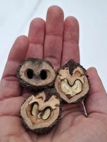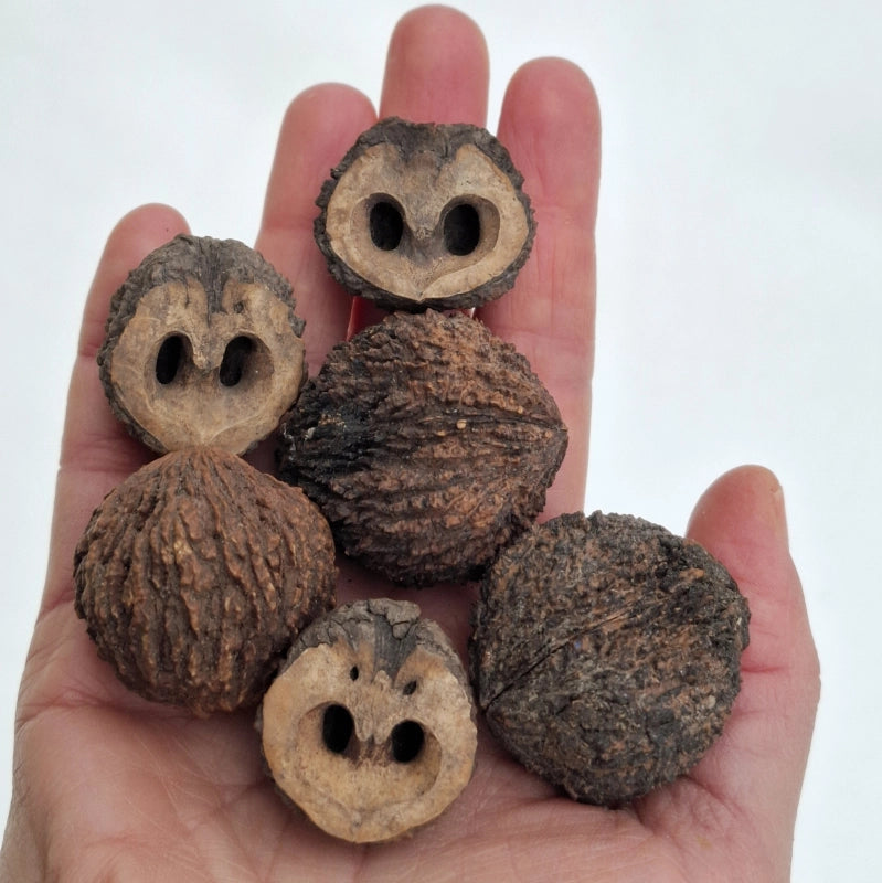 PLODY: veľké (priemerne 3,5-8 cm aj s rubinou, 3-4 cm bez nej), guľovité. Rubina je veľmi silne, živične voňavá, pri dozrievaní černie, z toho je odvodený názov orecha. Rubina sa sama neotvára pri dozrievaní, treba ju ošúpať, aby sa orechy nekazili. Škrupina je veľmi tvrdá a hrubá. Skrýva živične aromatické a chutné, mastné jadro, ktoré sa nedá vylúskať vcelku kvôli množstvu pevných prepážok v plode. Priemerne obsahuje asi 14 % cukrov, 15 % bielkovín and 65 % tukov.