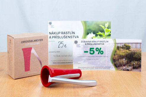 Zvýhodnený balíček "Luskáčik a tri oriešky" obsahuje: Luskáčik Drosselmeyer červený, darčekový poukaz v hodnote 25€ na nákup napríklad liesok, mandlí, orechov a poukaz na 5% zľavu na ďalší nákup rastlín a príslušenstva.