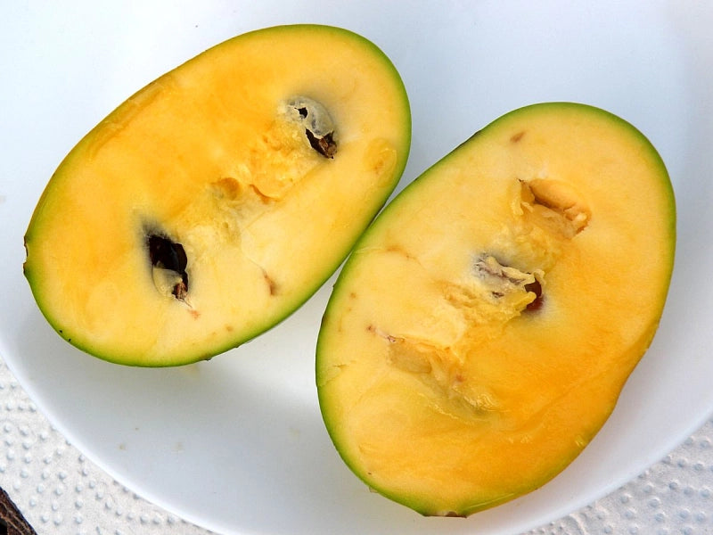PLODY: sú stredne veľké až veľké (v Rakúsku priemerne 172 g, v Taliansku aj 195-209,5 g, najťažšia plody aj 390 g), oválne. Šupka je v plnej zrelosti jasne žltozelená. Dužina je mangovožltá až svetlooranžová, krémová až pudingovitá, obsahuje menší až stredný počet semien (priemerne 10-12 % z objemu plodov). Chuť je veľmi dobrá, sladká, pripomína chuť banánu s nádychom citrusov, grapefruitu, ananásu a vanilky.