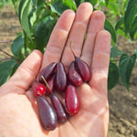 PLODY: veľké podlhovasté plody fľaškovitého tvaru a tmavočervenej farby s priemernou hmotnosťou 5,5-9 g. Dužina je tmavočervená, hustá, dobre oddeliteľná od kôstky, s jemnou arómou a plnou sladko-kyslastou chuťou s vysokým obsahom cukru 9,1 %, s obsahom kyselín 1,8 %.