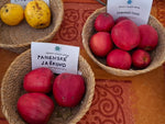 PLODY: malé, zriedkavo stredne veľké, najčastejšie tupo kužeľovité, pripomína vajíčko skosené z oboch pólov, niekedy je aj guľaté. Šupka je lesklá, takmer celá súvislo červená, niekedy červeno pruhovaná, pri zbere modravo osrienená. V zatienenej polovici plodu presvitá základná žltozelená farba. Dužina je biela, pod šupkou niekedy naružovelá, jemná, hustá, šťavnatá, sladká až ľahko kyslastá, príjemne voňavá, výborná.
